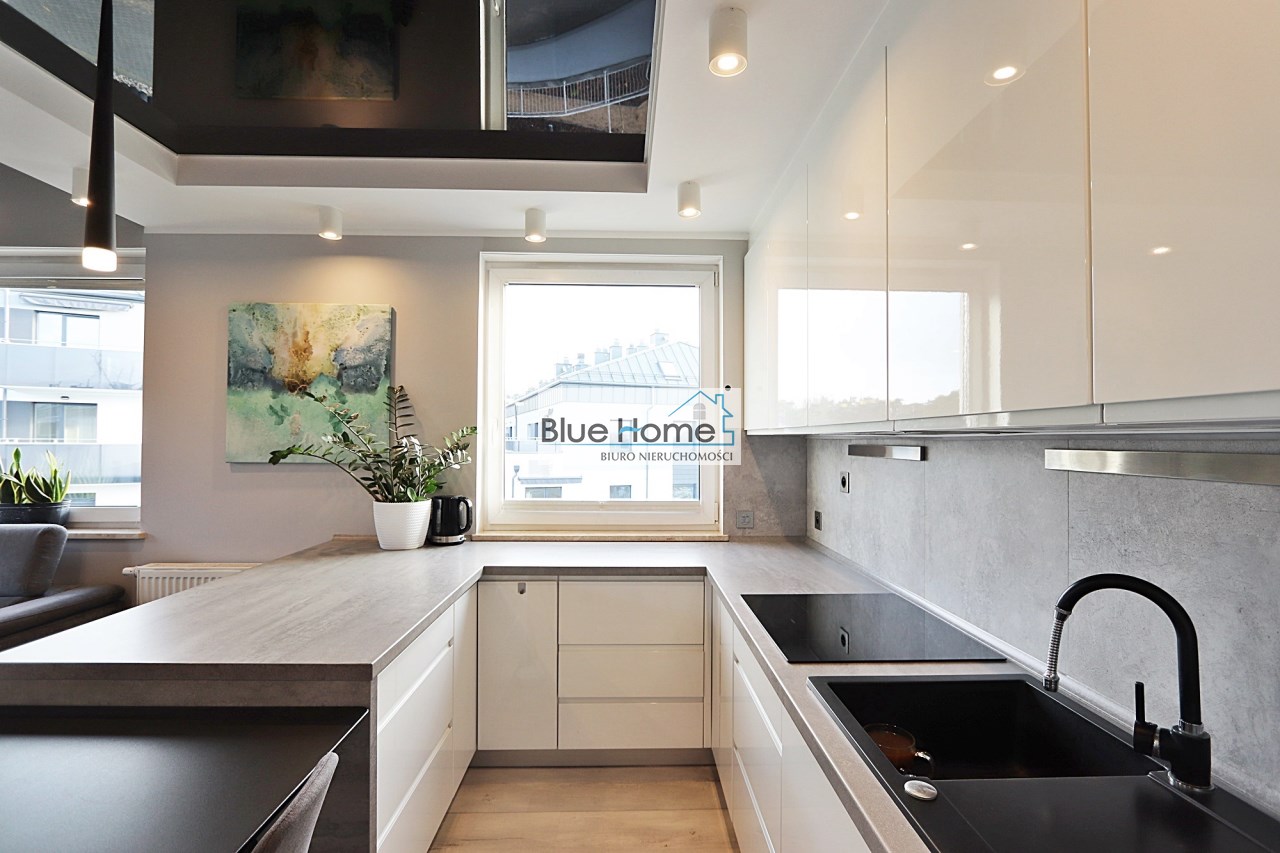 Kuchnia w zabudowie na wymiar z napinanym sufitem.