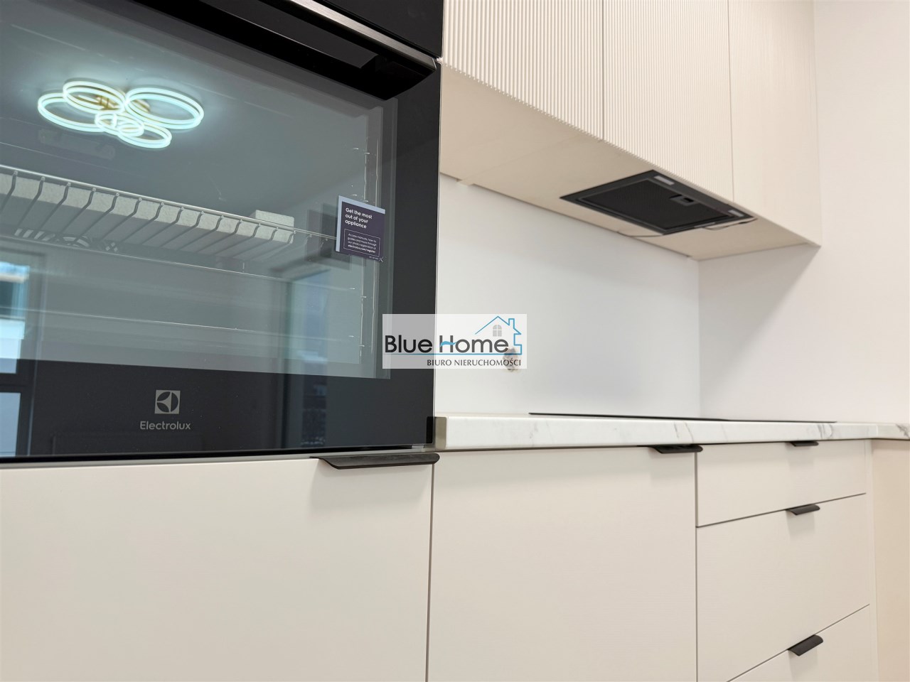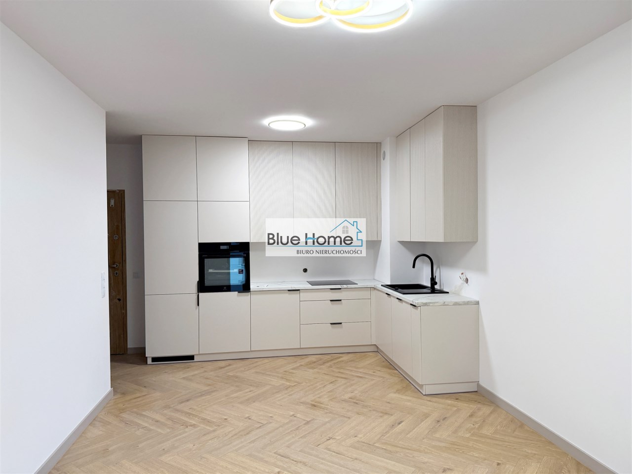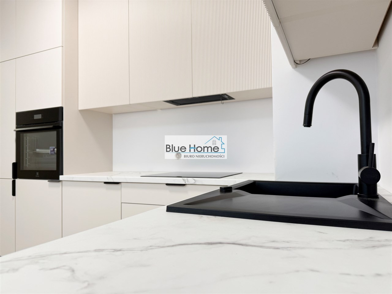 – nowoczesna kuchnia na wymiar z systemem Blum, w odcieniu szampańskiego Kaszmiru, z ryflowanymi frontami i blatem imitującym marmur