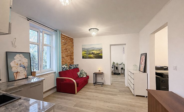 Na powierzchnię 56m2 składają się 2 oddzielne pokoje, kuchnia (o pow 20m2 istnieje możliwość wyodrębnienia 3 pokoju), łazienka z wc i przedpokój.