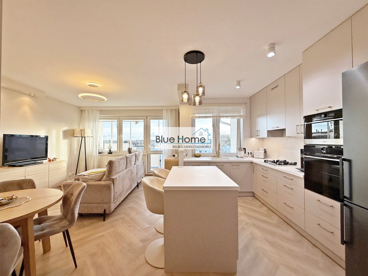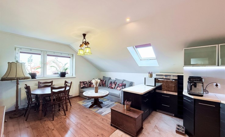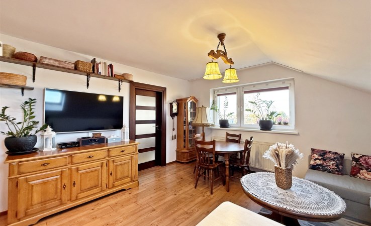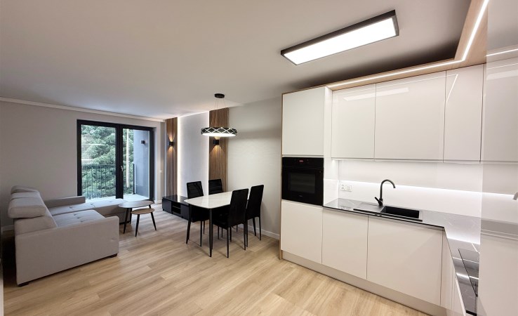 – przestronny salon połączony z nowoczesnym aneksem kuchennym oraz wyjściem na balkon