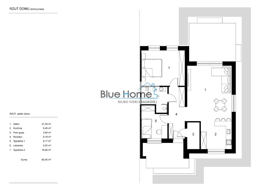 – salon z jadalnią 27,39 m² z wyjściem na taras