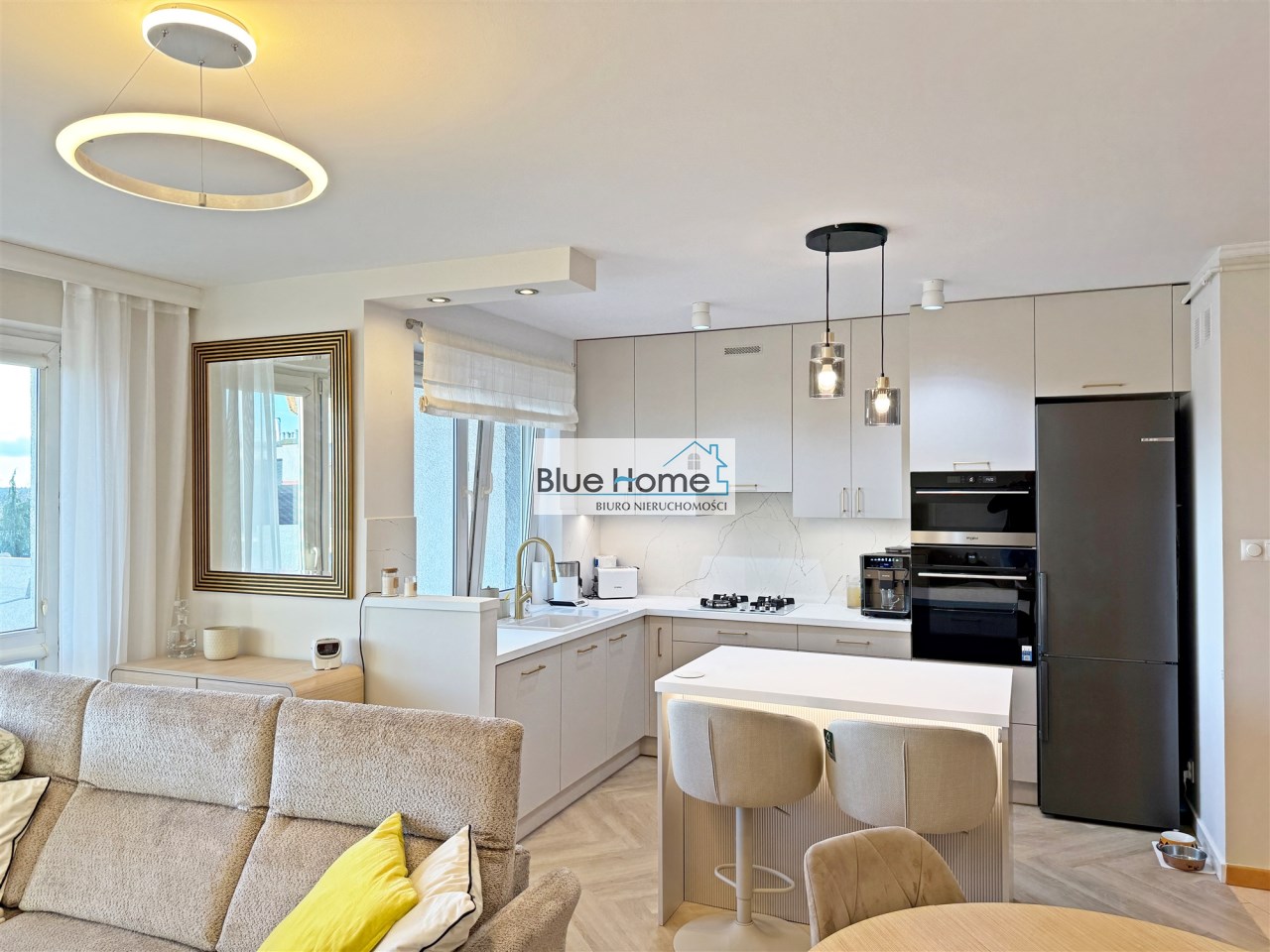 – przestronny salon połączony z nowoczesnym aneksem kuchennym oraz wyjściem na balkon
